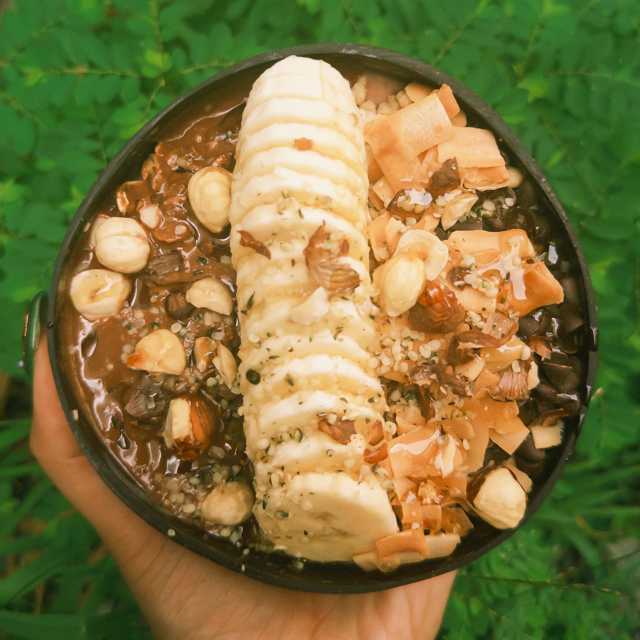 ココナッツチップ、ヘンプシード、自家製チョコヘーゼルナッツバター、ヘーゼルナッツスプリンクル、ハチミツ