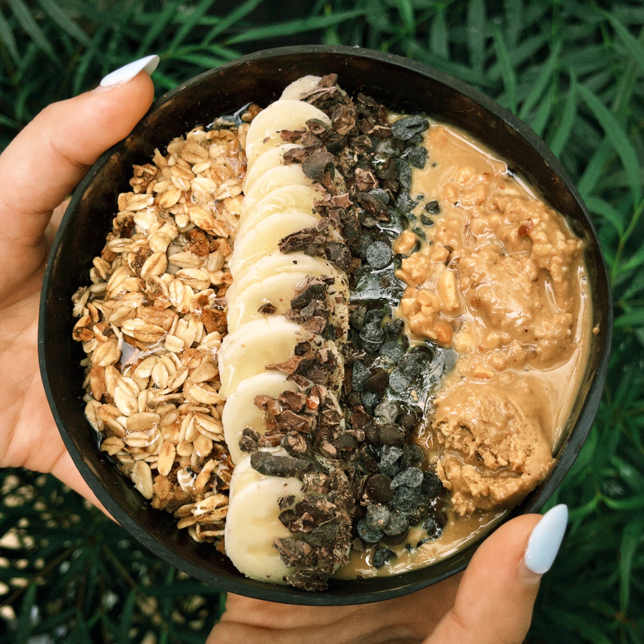 トッピング:自家製グラノーラ、バナナ、カカオニブ、チョコレートチップ、ピーナッツバター、蜂蜜、塩