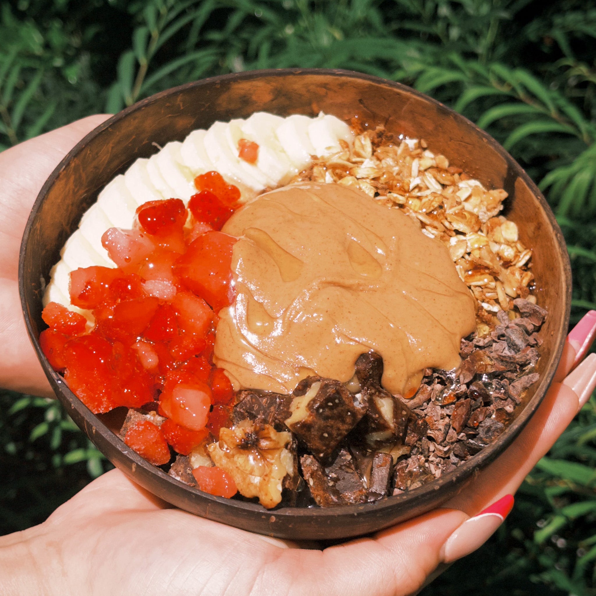 トッピング:自家製グラノーラ、ストロベリー、バナナ、自家製アーモンドバター、くるみブラウニー、カカオニブ、はちみつ